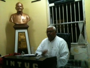 Saya senang mempunyai kesempatan untuk berkunjung kesini, saat itu pastinya saya ditemani Ashutosh, kawan saya untuk bertemu Brother Deoraj Singh, beliau ini presiden INTUC (pastinya yang pake baju putih itu lah ya). INTUC berdiri tahun 1947 (walahhhhh) dan sejak tahun tersebut kantor mereka tidak pernah pindah, walau dari tahun 47, ternyata kantornya masih status sewa dengan bea rendah. Menginjakkan kaki di depan kantor, kita bisa langsung lihat foto Mahatma Gandhi berukuran besar dan benar saja mereka hidup dengan ajaran Gandhi. Di sisi tembok banyak ajaran-ajaran Gandhi yang dibingkai.